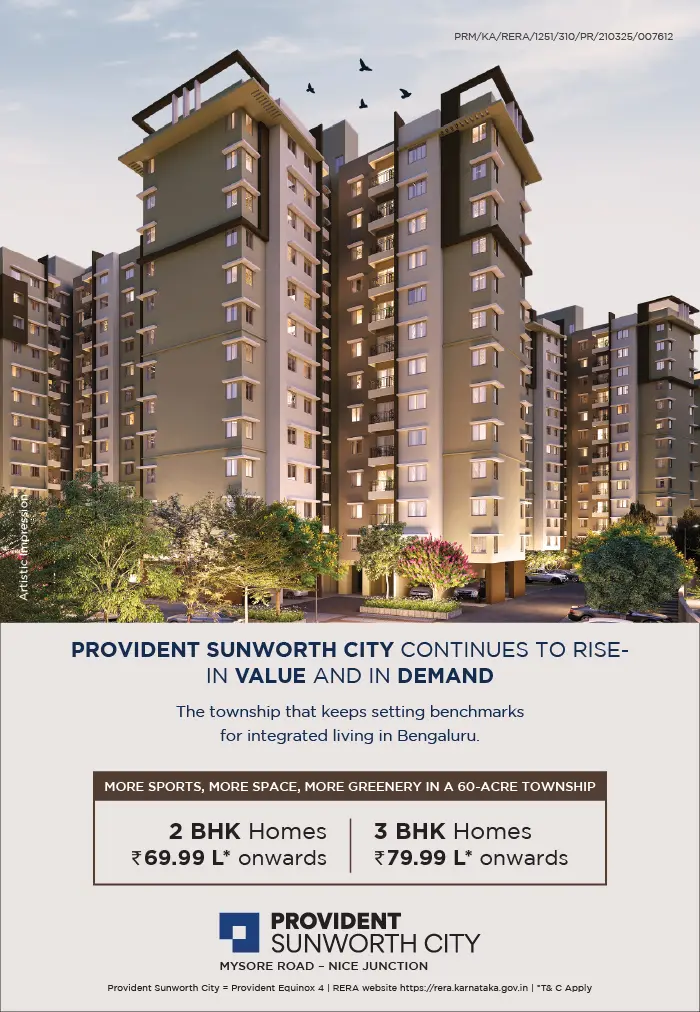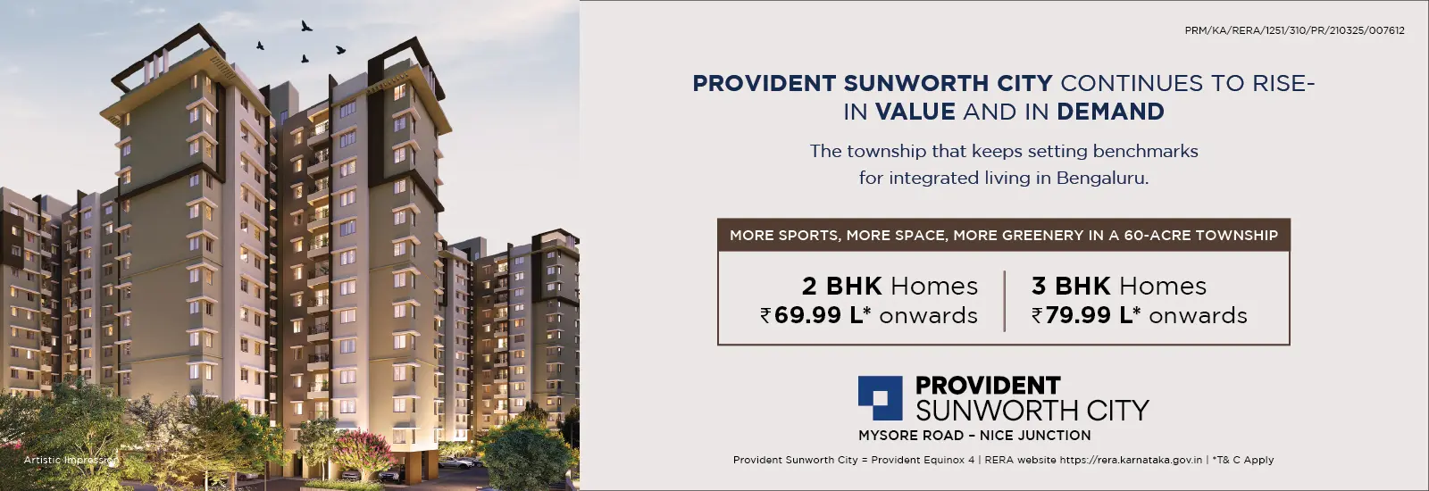 Provident Sunworth City offers 2BHK & 3BHK Apartments(Ready To Live Soon) Off Mysore Road near Challaghatta Metro Station, Bangalore. It is a part of an integrated lifestyle township sprawling over ~60 acres, a home at Provident Sunworth City brings every convenience to your doorstep without any compromise on connectivity to the rest of Bengaluru. The project offers signal free commute between Hosur and Tumkur road via NICE Road.